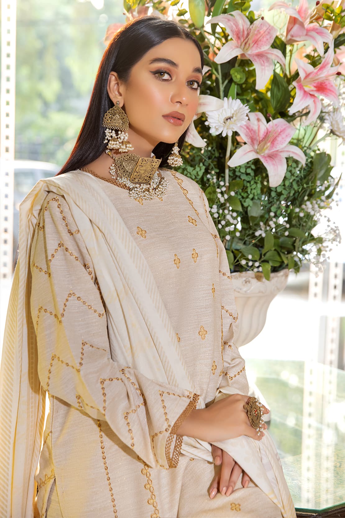 3 Piece – Luxury Embroidered Slub Zari Peach – 404