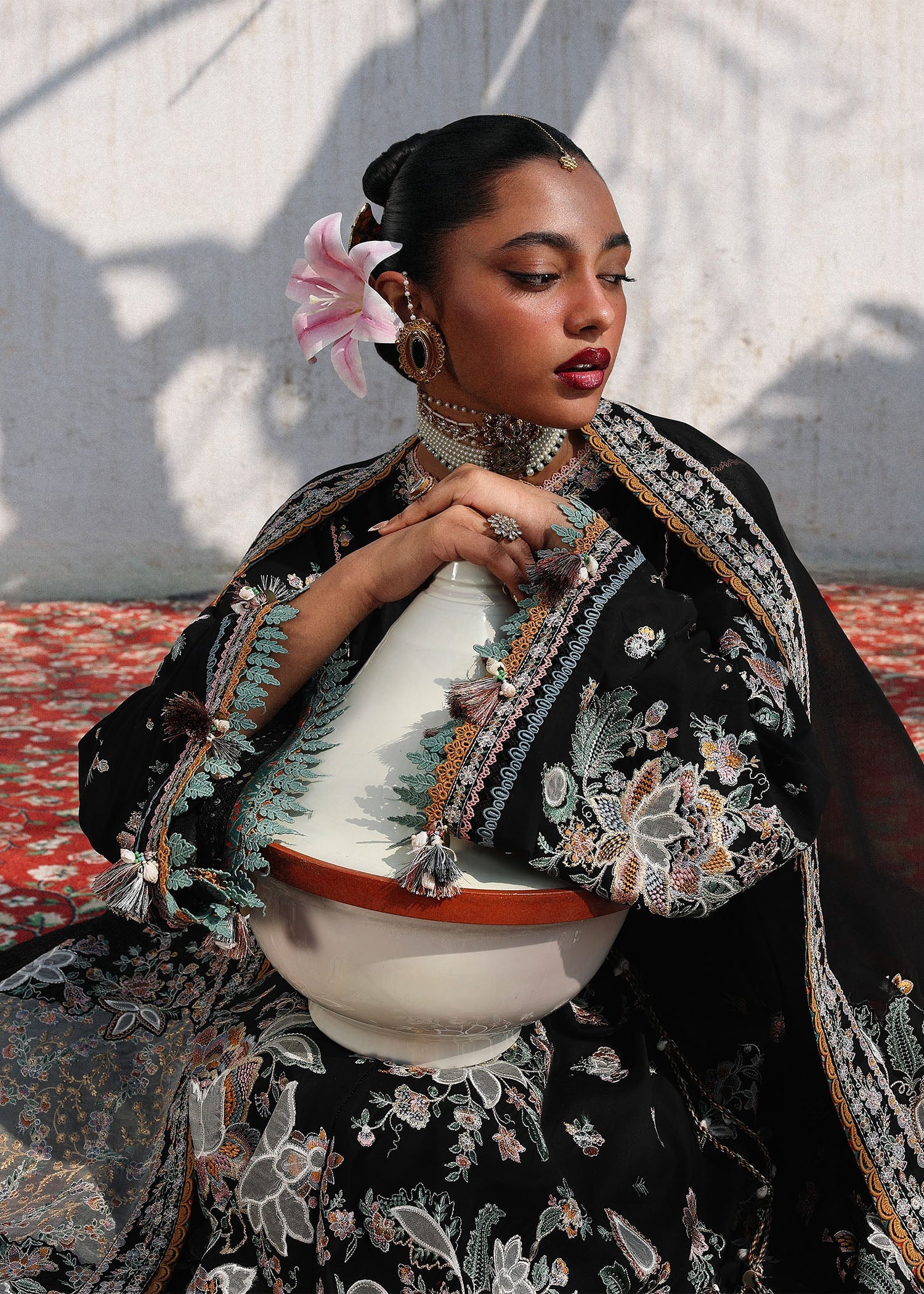 A striking jet-black ensemble is thoughtfully curated with delicate, soft-hued floral embroidery, beautifully appliquéd with off-white organza for a subtle contrast. The intricate detailing adds depth and sophistication, elevating the classic black base with a refreshing, airy feel. Paired with a color-blocked organza dupatta in timeless black and off-white shades, this ensemble makes a bold yet graceful statement—an undeniable head-turner for the summer season.